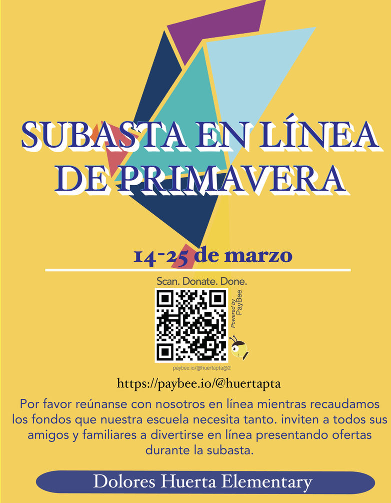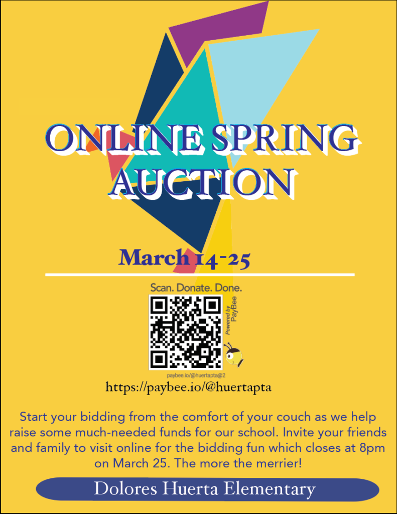 The PTA is proud to present the Dolores Huerta Spring Online Auction! Historically, we have had a fun adults-only party “Una Noche” along with our silent auction, but due to ongoing Covid concerns, we are going for a purely online auction again this year. Hopefully we will return to the party next year! In the meantime, please join the bidding fun and help keep our PTA funded to sustain all the great things happening in our DH community. Check out the many incredible items and experiences available from our amazing teachers and community members while raising money for our beautiful school. The auction is live through March 25. Use this link or QR code to get a jumpstart on all the amazing offerings. Best of luck to all!