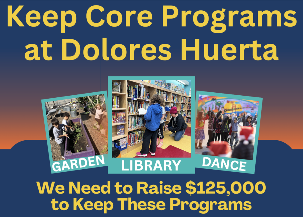 The district budget cuts have been announced and we are facing a shortfall of $125,000 to keep some of our favorite programs going here at Dolores Huerta.  If we can’t raise enough money, we will have to cut some programs at the school. LIBRARY, DANCE AND GARDEN PROGRAMS ARE AT RISK!